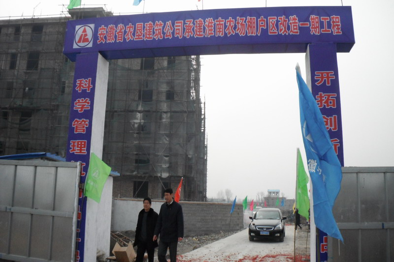 目前,省农垦淮南农场棚户区改造项目一期工程正在抓紧施工,该工程纳入安徽农垦2011年度危房改造项目,结合省农垦集团和淮南市垦地合作开发建设,总投资8000万元,总建筑面积共计12栋54000平方米,由淮南垦投公司负责建设,安徽垦建公司承建,主要用于安置淮南市朝阳东路建设的农场拆迁户,建成后可安置职工居民600户。