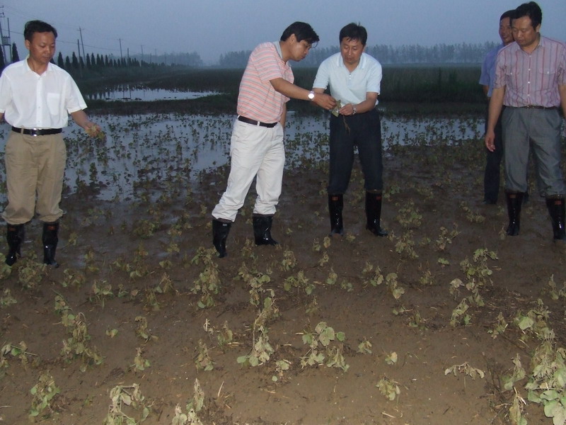 场长柏华胜在现场向王总一行汇报了农场抗灾救灾情况。7月10日特大汛情是凤阳县有气象记录以来最强的一次。灾情发生后,场防指靠前指挥,科学调度,组织一切力量全力抢排圩内积水,比预计时间提前了十几个小时将内涝排除,但由于积水时间过长,在地作物大部分死亡,损失惨重。此次暴风雨灾害还致使部分项目区工程受损、场区部分民房毁损、围墙倒塌、道路被冲毁,严重影响了职工的生产生活。场领导班子不等不靠,在耐心疏导职工情绪的同时,认真开展补种抢种各项准备工作。