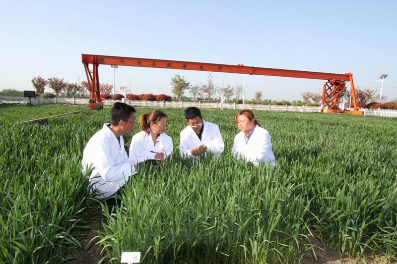 上图1.农场副场长、高级农艺师王永玖带领科研人员在小麦高通量育种试验田查看苗情
