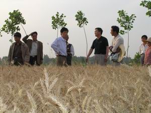 针对近日天气状况可能对麦收带来不利影响的形 势,潘村湖农场午收夏种指挥部于6月3日下午召开 紧急会议,要求各农业分场立足“早”字,突出 “抢”字,克服“靠干”思想,成熟一块收获一 块,力争把到手的粮食抢收上来。到3日晚上9点, 该场六分场已完成收获任务的70%%。图为韩大鸣场 长、殷文格副场长在田间指挥午收生产。(杨登宏)