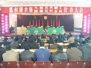 潘村湖农场九届五次职工代表大会和四届五次会员 代表大会于3月4日召开。本次大会的主要议程包 括:听取和审议《场长工作报告》、《工会工作报 告》、《代表提案处理情况报告》、《集体合同履 行情况的报告》、《财务决算报告》以及民主评议 场级领导干部。大会还对2004年度涌现的先进集体 和先进个人进行了表彰。图为大会场景。(杨登宏 摄)